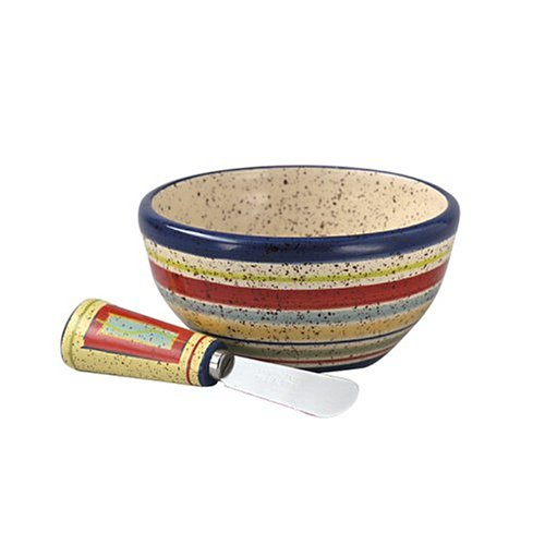 An assortment of vivid stripes in earthy tones spice up the flecked cream glaze on this set's dip bowl; while a contemporary Southwest design seasons the handle of the coordinating spreader. Together, this Southwest-inspired Sedona party set provides a festive way to serve jalapeƱo cheese spread, creamy dill dip, or a holiday cranberry chutney. The 11-ounce bowl is crafted from sturdy stoneware so it can double as a ramekin for baking or heating dips. This versatile piece also goes safely into the dishwasher, freezer, oven, and microwave. The spreader's hand-painted resin handle should be washed by hand to preserve its rich color. Pfaltzgraff offers a five-year warranty against defects will replace pieces individually.